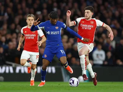 صراع على الكرة بين ديكلان رايس لاعب أرسنال ونوني مادويكي لاعب تشيلسي السابق خلال مواجهة الفريقين بالدوري الإنجليزي الممتاز - 23 أبريل 2024 - Reuters