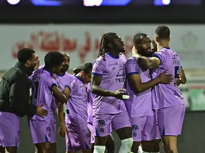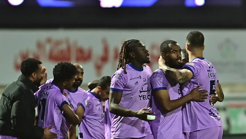 لاعبو الخلود يحتفلون بالتسجيل في مرمى الرياض بالدوري السعودي - 8 فبراير 2025 - X/@SPL