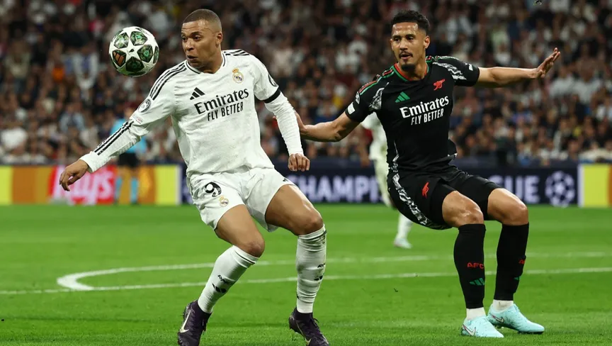 ويليام ساليبا في صراع على الكرة مع كيليان مبابي بمواجهة ريال مدريد وأرسنال ضمن دوري أبطال أوروبا - 16 أبريل 2025 - Reuters