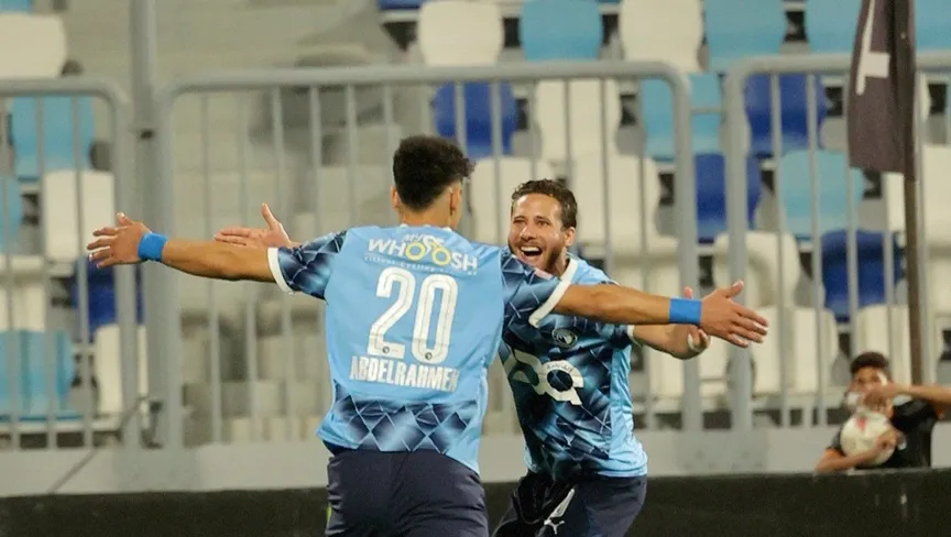 عبد الرحمن مجدي يحتفل مع رمضان صبحي بهدف بيراميدز الأول في مرمى سيراميكا كليوباترا - 28 مايو 2025 - x/@pyramidsfc