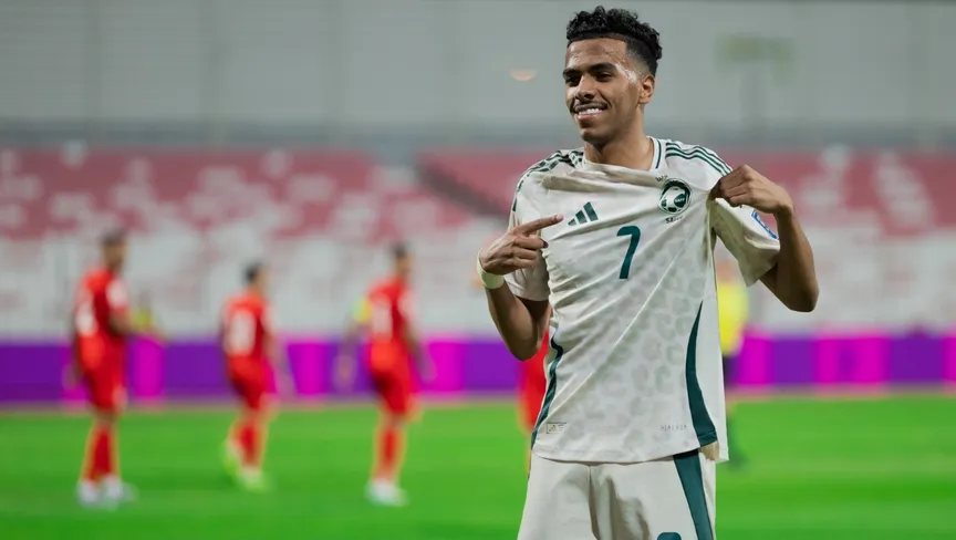 مصعب الجوير لاعب وسط السعودية يحتفل بهدفه في مرمى البحرين في تصفيات كأس العالم - 5 يونيو 2025 - Reuters