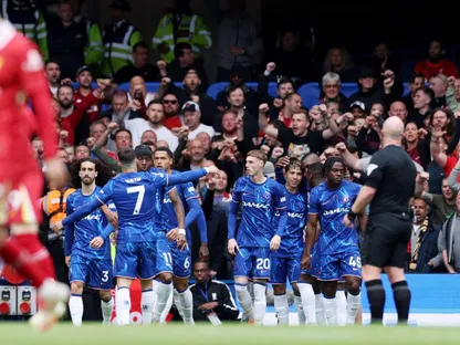 لاعبو تشيلسي يحتفلون بتسجيل هدف بمواجهة ليفربول في الدوري الإنجليزي الممتاز - 4 مايو 2025 - Reuters