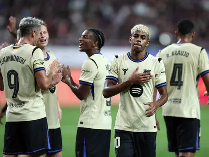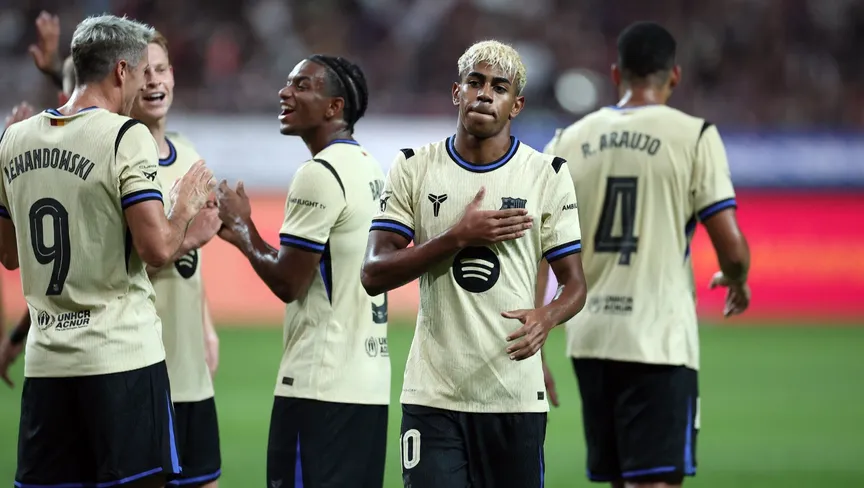 لامين يامال يحتفل بتسجيله ثاني أهداف برشلونة ضد أف سي سيول - 31 يوليو 2025 - Reuters