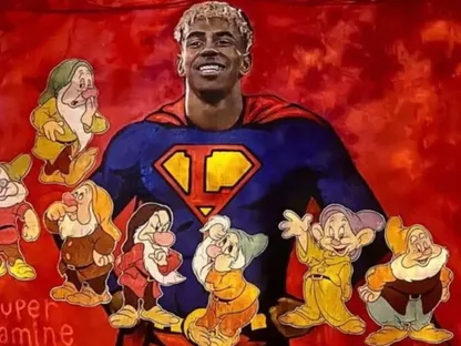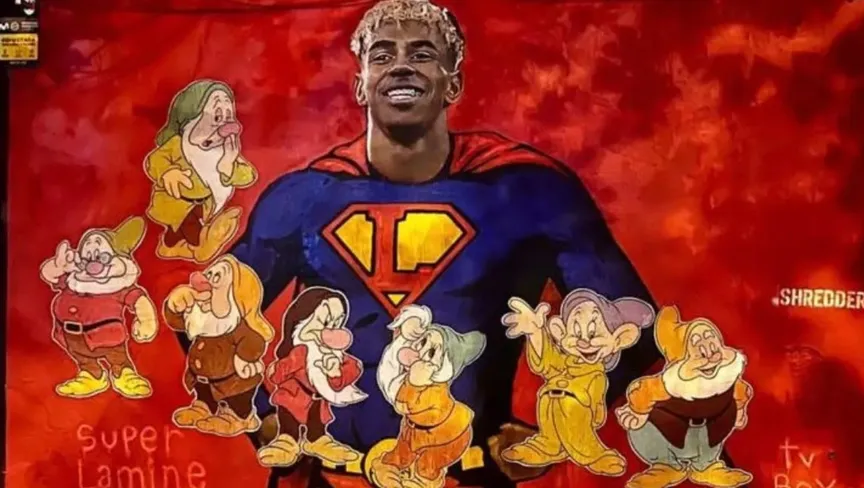 جدارية ساحة خوانيك التي أظهرت لامين يامال مرتدياً زي الشخصية الأميركية الخيالية الشهيرة "سوبرمان" لكن مع حرف L على صدره بدلاً من حرف S الكلاسيكي.