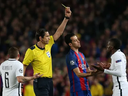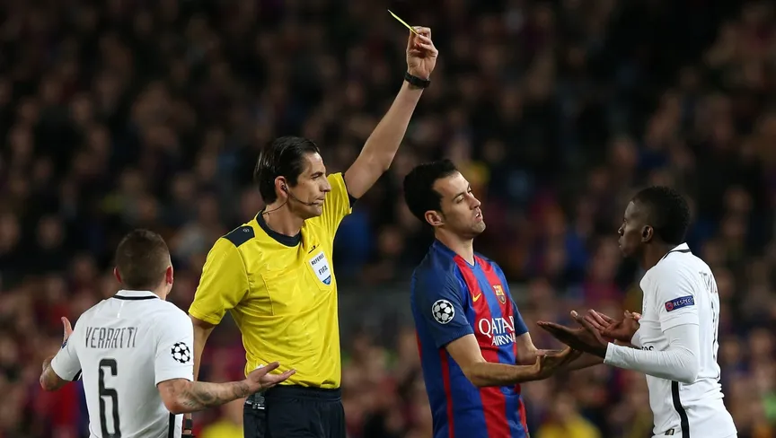 الحكم دينيز أيتيكين يشهر بطاقة صفراء لبليز ماتويدي لاعب باريس سان جيرمان خلال مواجهة برشلونة في إياب دور الـ16 من دوري أبطال أوروبا - 8 مارس 2017 - Reuters