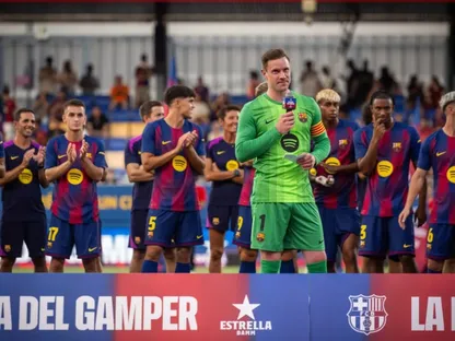 قائد برشلونة مارك أندريه تير شتيغن ولاعبو الفريق قبل مباراة كومو في كأس جوان غامبر - 11 أغسطس 2025 - www.fcbarcelona.com