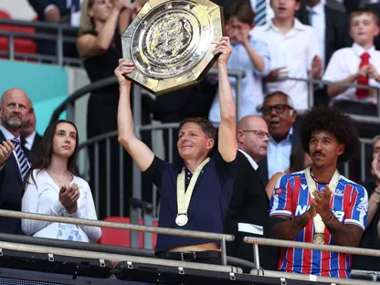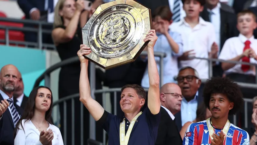 أوليفر غلاسنر مدرب كريستال بالاس يرفع درع المجتمع بعد الفوز على ليفربول بركلات الترجيح - 10 أغسطس 2025 - X/@CPFC