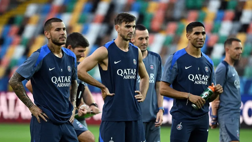 حكيمي وفابيان رويز ولوكاس هيرنانديز في آخر حصة تدريبية قبل مواجهة توتنهام في السوبر الأوروبي - 12 أغسطس 2025 - Reuters