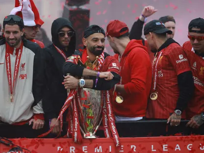 محمد صلاح مع لاعبين من ليفربول في حافلة خلال موكب نصر احتفالاً بلقب الدوري الإنجليزي الممتاز - 26 مايو 2025 - Reuters