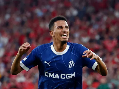 احتفال عز الدين أوناحي بتأهل أولمبيك مارسيليا على حساب بنفيكا في الدوري الأوروبي - 11 أبريل 2024 - Reuters
