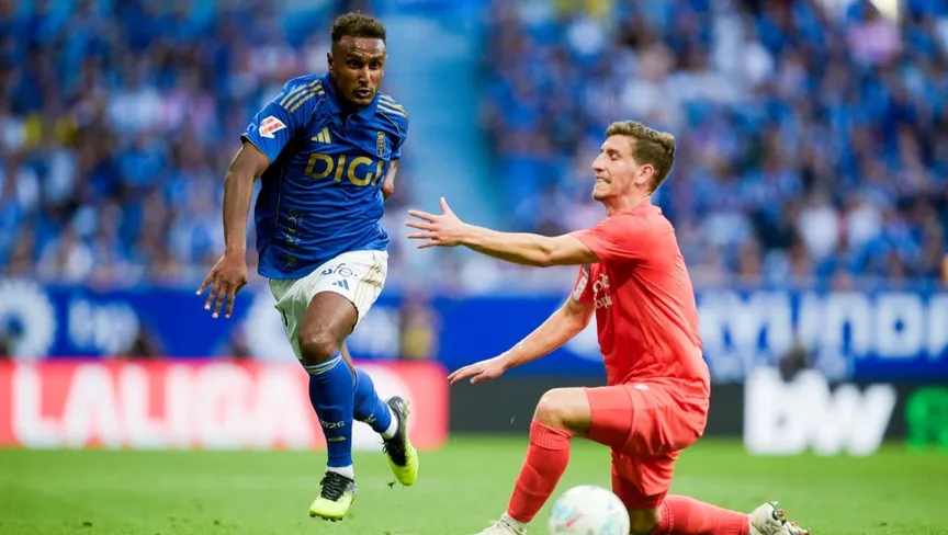 هيثم حسن مهاجم أوفييدو يتخطى حارس ريال سوسيداد بالدوري الإسباني - 30 أغسطس 2025 - X@RealOviedo