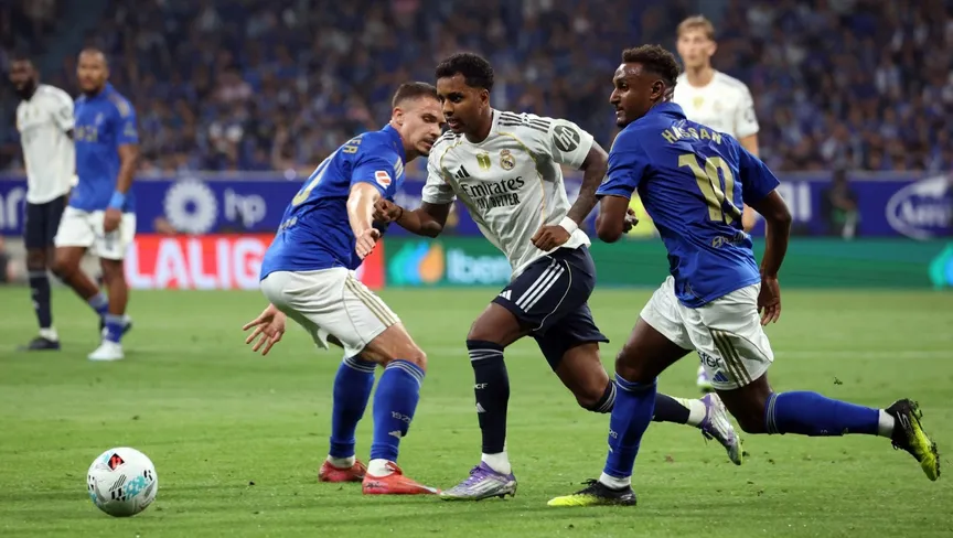 هيثم حسن لاعب ريال أوفييدو يحاول قطع الكرة من رودريغو لاعب ريال مدريد في مباراة الفريقين بالدوري الإسباني - 24 أغسطس 2025 - Reuters