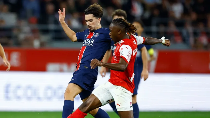 فالنتين أتانغانا لاعب ريمس في صراع على الكرة مع فيتينيا لاعب باريس سان جيرمان ضمن الدوري الفرنسي - 22 سبتمبر 2024 - Action Images REUTERS
