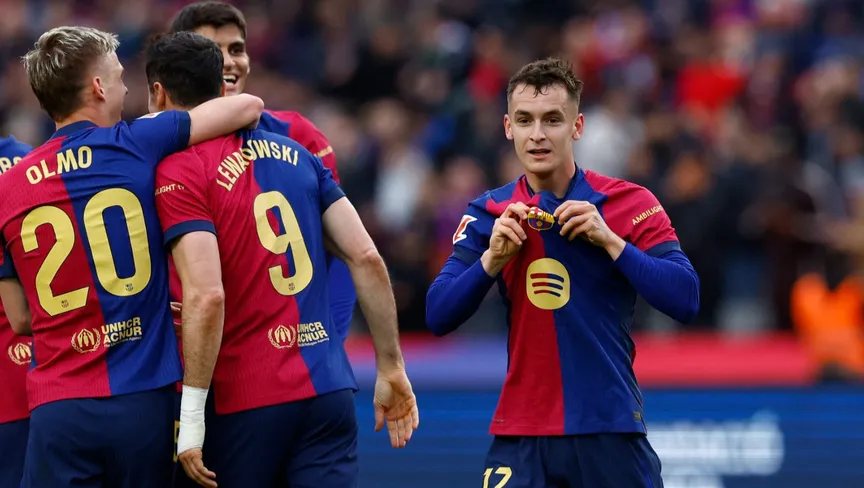 لاعب برشلونة مارك كاسادو يحتفل بالتسجيل مع زملائه في الفريق ضد ريال سوسيداد في الدوري الإسباني - 2 مارس 2025 - Reuters