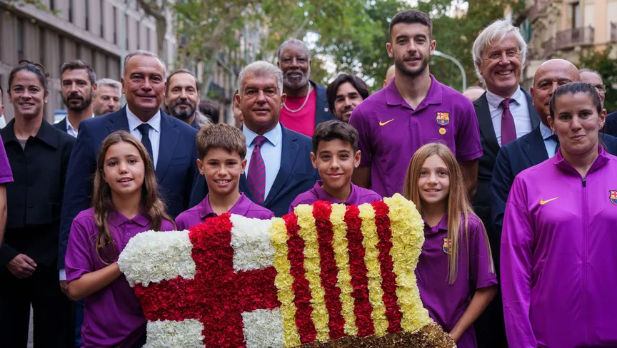 رئيس برشلونة جوان لابورتا خلال العيد الوطني لكاتالونيا وبدا الحارس جوان غارسيا إلى يساره - 11 سبتمبر 2025 - fcbarcelona.com