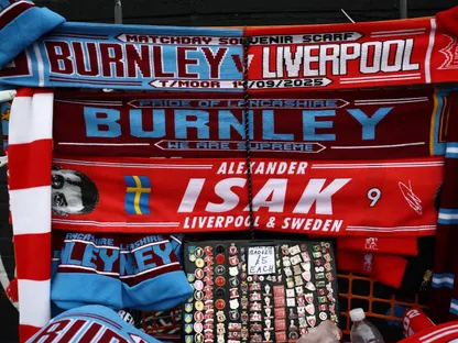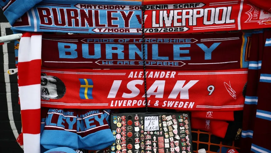 بيع منتجات خاصة بمباراة بيرنلي وليفربول قبل انطلاق المباراة في البريميرليغ - 14 سبتمبر 2025 - Action Images via Reuters
