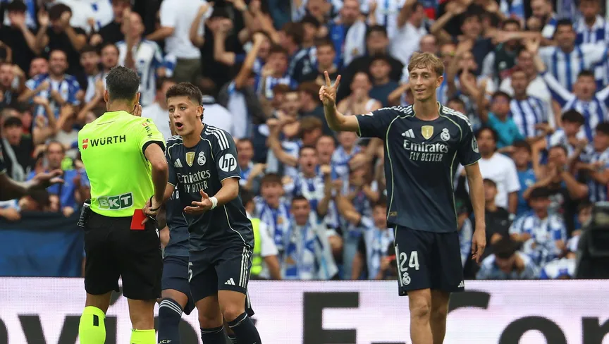 أردا غولر ودين هويسن يحتجّان على الحكم خيسوس خيل مانزانو بعدما طرد المدافع خلال مباراة ريال مدريد وريال سوسيداد بالدوري الإسباني - 13 سبتمبر 2025 - Reuters