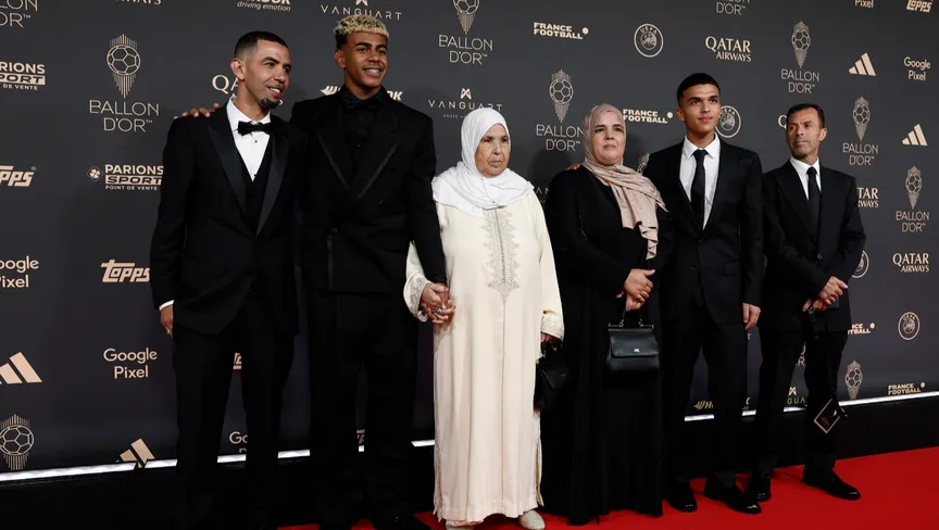 ورافق يامال عدد كبير من أفراد عائلته إلى مقر الحفل، ومن بينهم جدته فاطمة التي يعتز بها كثيراً لدورها في تربيته بعد انفصال والديه.