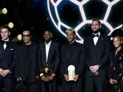 عثمان ديمبيلي بجوار لامين يامال ورونالدينيو وجيانلويجي دوناروما وفيكتور غيوكيريس بعد تسليم جوائز الكرة الذهبية - 22 سبتمبر 2025 - Reuters