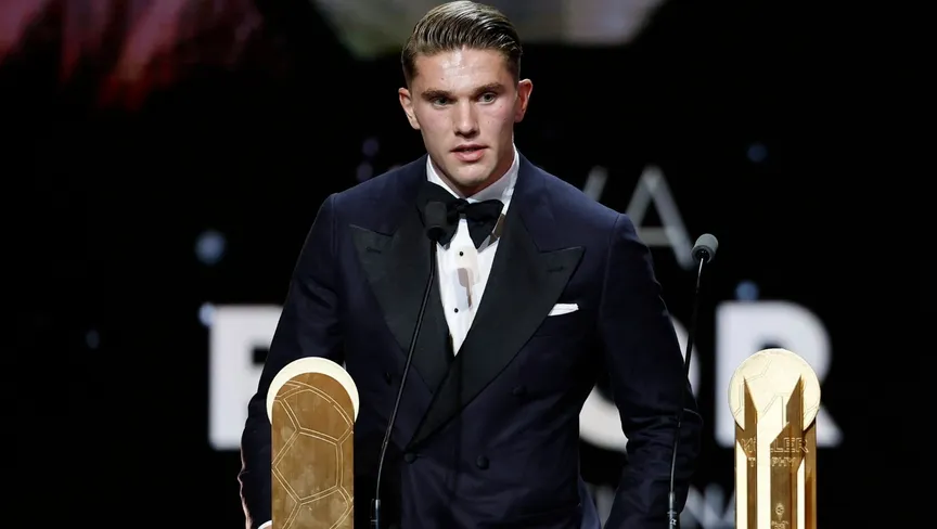 حصل فيكتور غيوكيريس على الجائزة في حفل الكرة الذهبية، أمس الاثنين، متفوقاً على كيليان مبابي مهاجم ريال مدريد الذي تُوج بالحذاء الذهبي الموسم الماضي.
