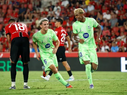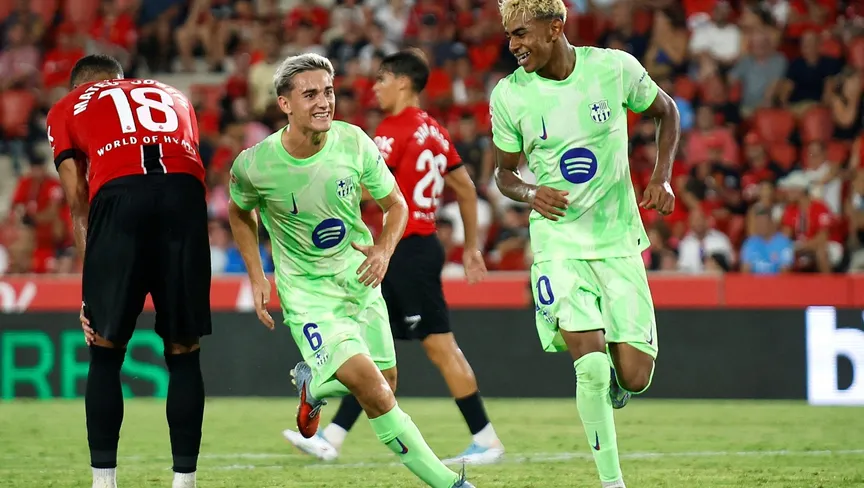 غافي لاعب برشلونة يحتفل مع لامين يامال خلال مواجهة مايوركا - 16 أغسطس 2025 - Reuters