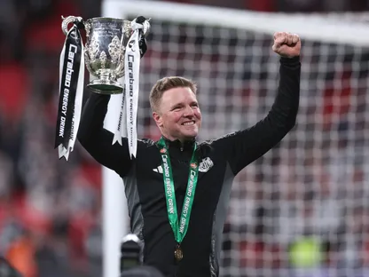 مدرب نيوكاسل يونايتد إيدي هاو يحمل "كأس كاراباو" بعد الفوز على ليفربول في النهائي - 16 مارس 2025 - Reuters