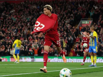 هوغو إيكيتيكي يحتفل بنزع القميص رغم امتلاكه انذاراً في مباراة ليفربول وساوثهامبتون بكأس الرابطة - 23 سبتمبر 2025 - Reuters