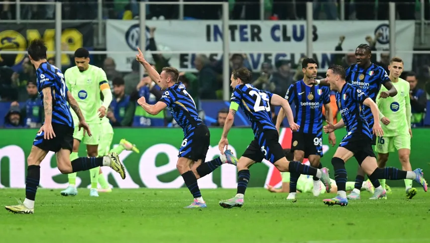 لاعب إنتر ميلان ديفيد فراتيسي يحتفل بالتسجيل مع زملائه في الفريق بنصف نهائي دوري أبطال أوروبا أمام برشلونة - 6 مايو 2025 - ٌReuters
