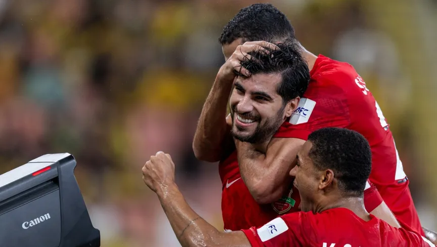 احتفال لاعبي شباب الأهلي دبي بتسجيل هدف في مرمى الاتحاد بدوري أبطال آسيا للنخبة - 30 سبتمبر 2025 - X/@Shabab_AlAhliFC