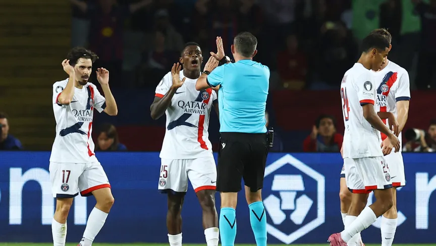 نونو مينديز وفيتينيا مع الحكم مايكل أوليفر خلال مباراة بين برشلونة وباريس سان جيرمان في دوري أبطال أوروبا - 1 أكتوبر 2025 - REUTERS
