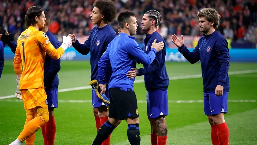 مصافحة بين أنطوان غريزمان ولاوتارو مارتينيز قبل مواجهة أتلتيكو مدريد وإنتر ميلان بدوري أبطال أوروبا - 13 مارس 2024 - Reuters
