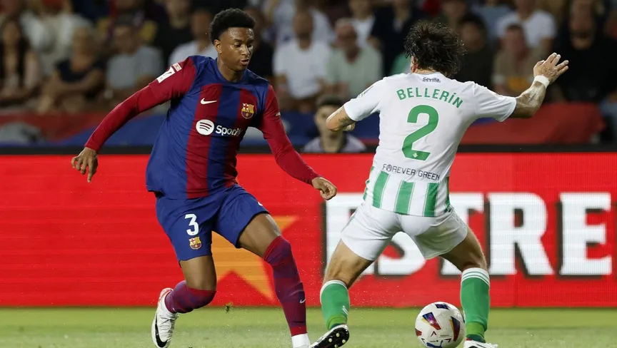 أليخاندرو بالدي لاعب برشلونة يراوغ هيكتور بيليرين لاعب ريال بيتيس خلال مواجهة الفريقين - REUTERS