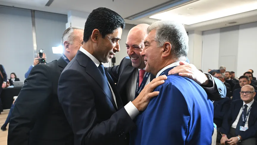 رئيس باريس سان جيرمان ناصر الخليفي يستقبل رئيس برشلونة جوان لابورتا خلال الجمعية العامة لرابطة الأندية الأوروبية في روما - 8 أكتوبر 2025 - X/@EFC_Football