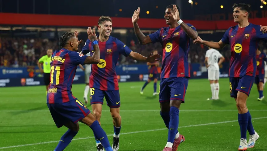 احتفال راشفورد ورافينيا بهدف برشلونة الثاني أمام فالنسيا بالدوري الإسباني 14 سبتمبر 2025 - Reuters