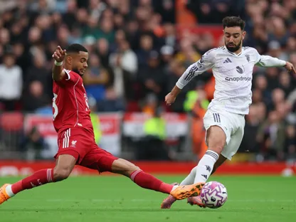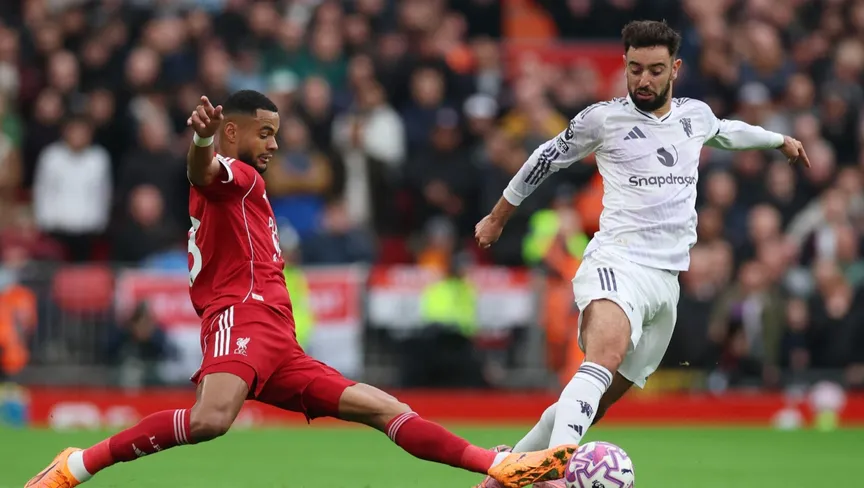 برونو فرنانديز لاعب مانشستر يونايتد في كرة مشتركة مع كودي خاكبو لاعب ليفربول - 19 أكتوبر 2025 - Reuters