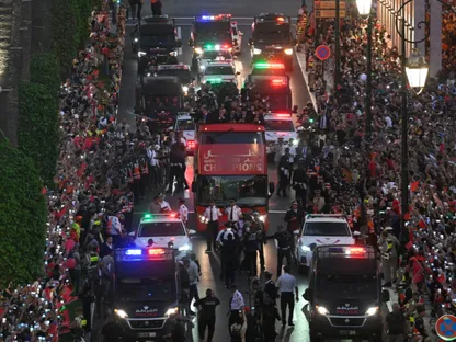 وطاف اللاعبون في حافلة مكشوفة وسط العاصمة الرباط، بعد استقبالهم في القصر الملكي من قبل ولي عهد المغرب الأمير الحسن بن محمد بتعليمات من العاهل المغربي.