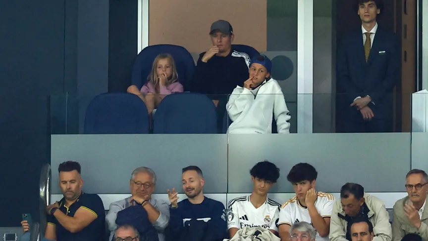 توني كروس مع اثنين من أطفاله يتابع مباراة لريال مدريد ضد فياريال في "سانتياغو برنابيو" - 5 أكتوبر 2024 - Reuters