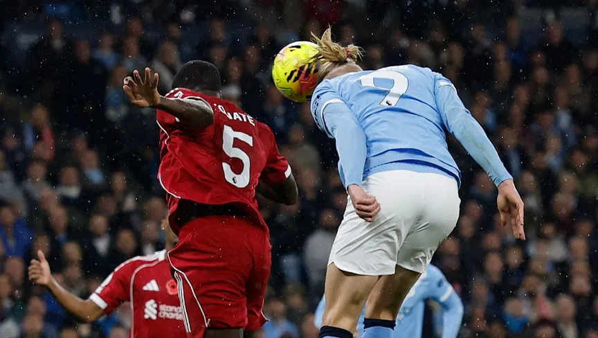 إيرلينغ هالاند مهاجم مانشستر سيتي يوجه رأسية قوية في شباك ليفربول بالدوري الإنجليزي - 9 نوفمبر 2025 - REUTERS
