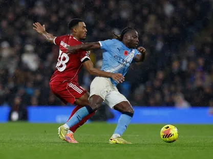 جيريمي دوكو لاعب مانشستر سيتي يركض بالكرة وريان غرافنبيرخ لاعب ليفربول يحاول اللحاق به - 9 نوفمبر 2025 - REUTERS
