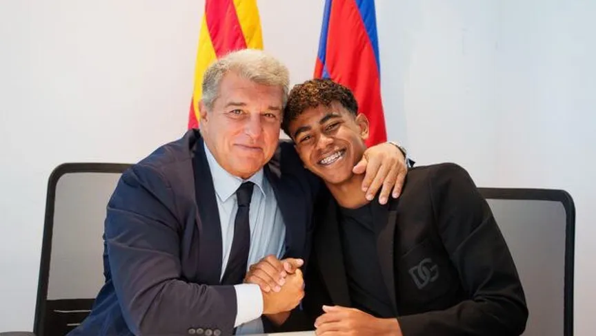 لامين يامال مع رئيس برشلونة جوان لابورتا في مقر نادي برشلونة بملعب كامب نو - sport/x