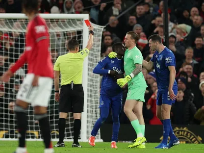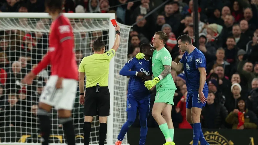 طرد ادريسا جانا غاي بعد مشاجرة مع زميله في إيفرتون مايكل كين خلال مباراة مانشستر يونايتد بالدوري الإنجليزي - 24 نوفمبر 2025 - Reuters