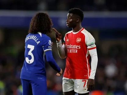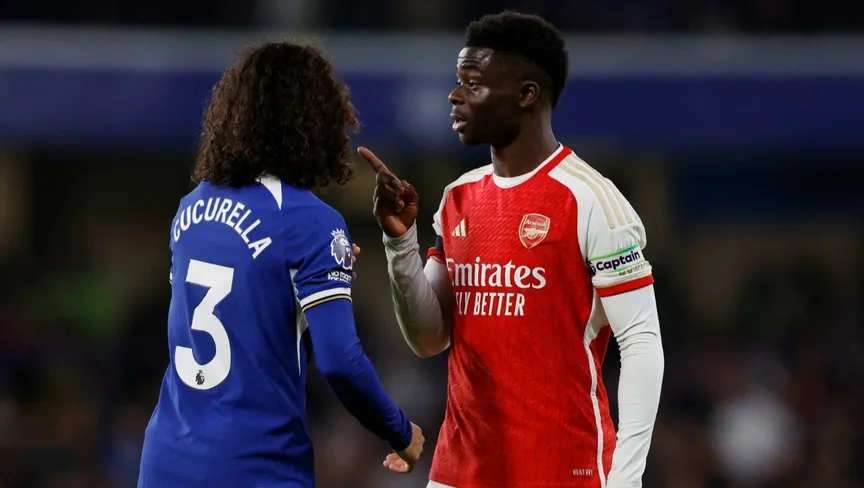 مشادة بين بوكايو ساكا لاعب أرسنال ومارك كوكوريا مدافع تشيلسي خلال مواجهة الفريقين في الدوري الإنجليزي الممتاز - 23 إبريل 2024 - reuters