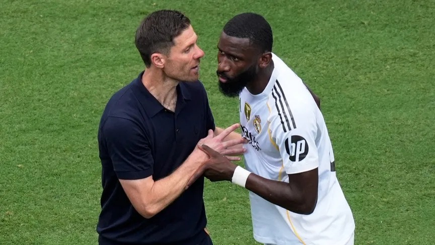 أنطونيو روديغر مدافع ريال مدريد ومدربه تشابي ألونسو خلال مواجهة باتشوكا في مونديال الأندية - 23 يونيو 2025 - Reuters