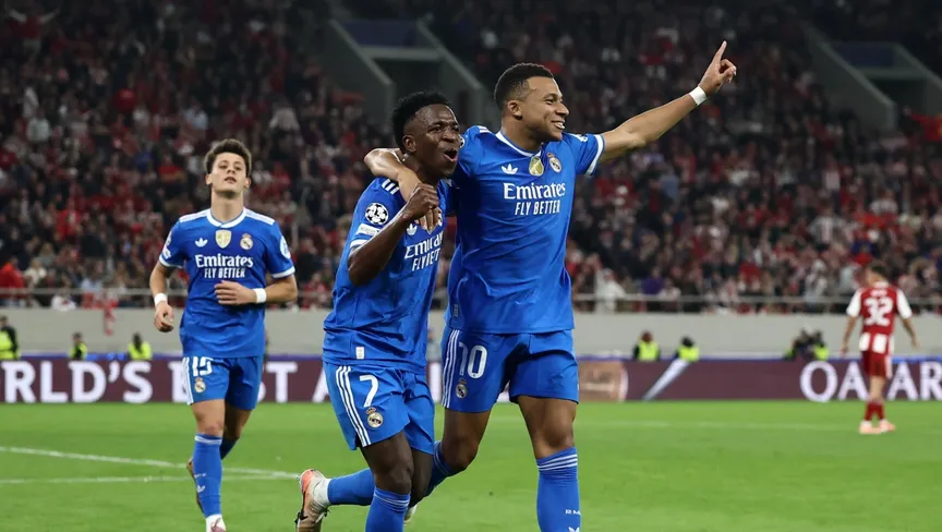 كيليان مبابي مهاجم ريال مدريد يحتفل مع زميله فينيسيوس جونيور بهدفه في شباك أولمبياكوس اليوناني بدوري أبطال أوروبا - 26 نوفمبر 2025 - Reuters