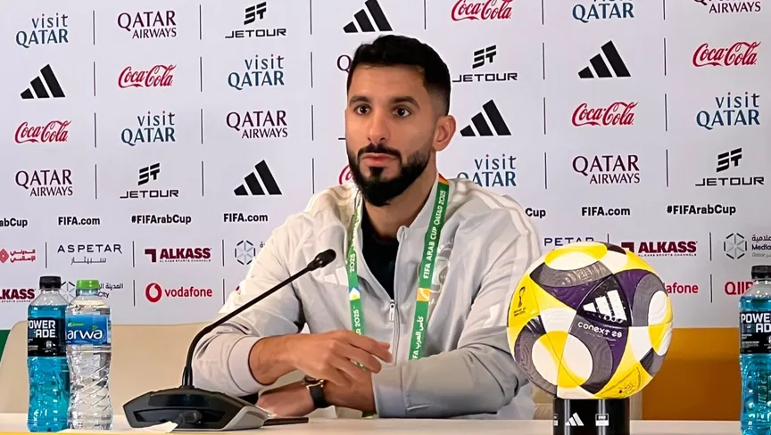 صالح الشهري مهاجم منتخب السعودية في مؤتمر صحافي - 4 ديسمبر 2025 - X/@aawsat_spt