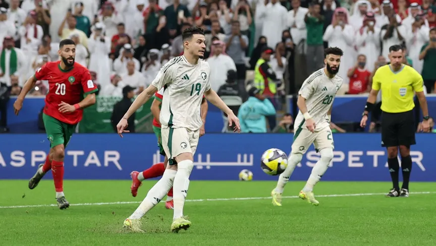 عبد الله الحمدان أثناء تنفيذ ركلة جزاء في مباراة المغرب والسعودية بكأس العرب - 8 ديسمبر 2025 - Reuters