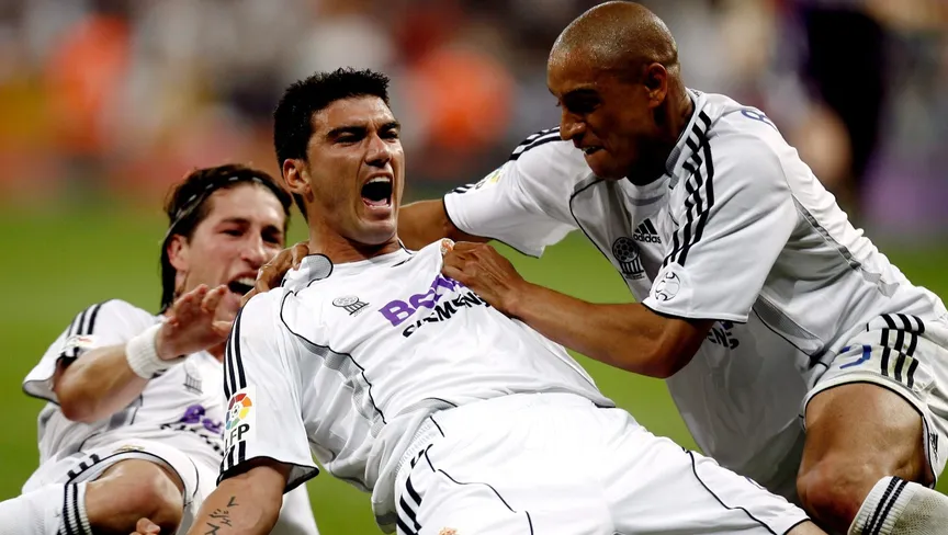 خوسيه أنطونيو رييس يحتفل بهدفه التاريخي مع ريال مدريد رفقة سيرخيو راموس وروبرتو كارلوس أمام مايوركا - 17 يونيو 2007 - Reuters