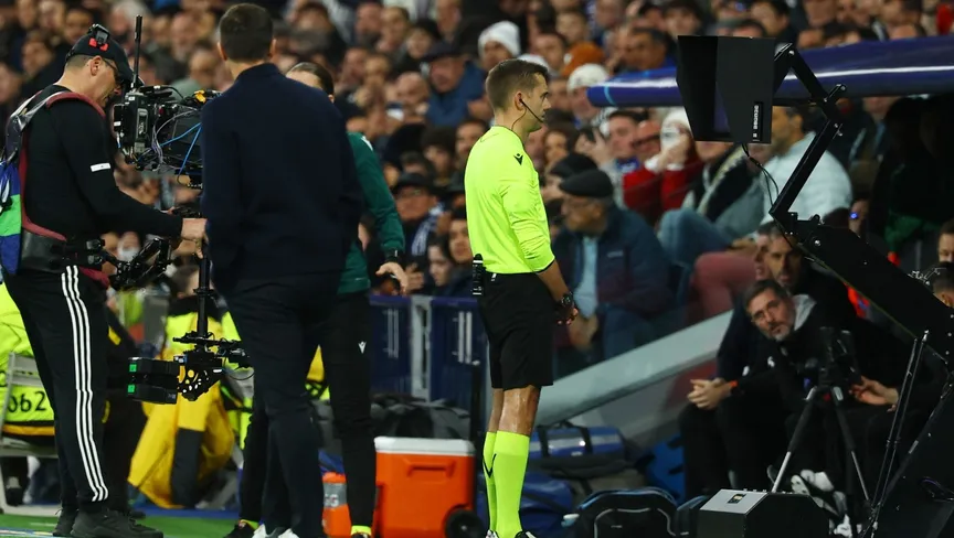 الحكم الفرنسي كليمون توربان خلال تحققه من ركلة جزاء مانشستر سيتي في مباراة ريال مدريد بدوري الأبطال - 10 ديسمبر 2025 - Reuters