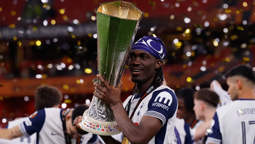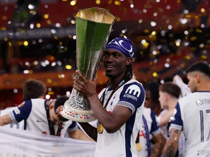إيف بيسوما لاعب توتنهام يحمل كأس الدوري الأوروبي بعد تتويج الفريق باللقب على حساب مانشستر يونايتد - 21 مايو 2025 - Reuters