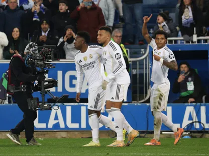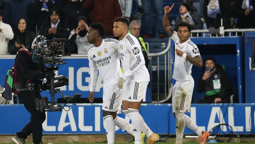 فينيسيوس يحتفل مع رودريغو وكيليان مبابي بعد هدف لريال مدريد ضد ألافيس - 14 ديسمبر 2025 - Reuters